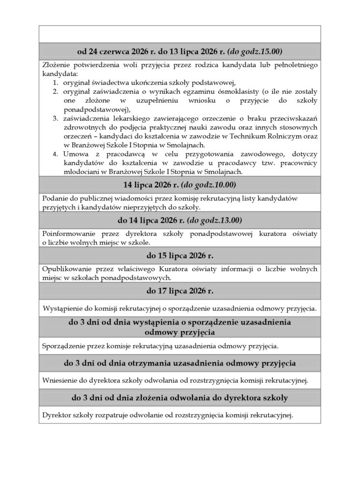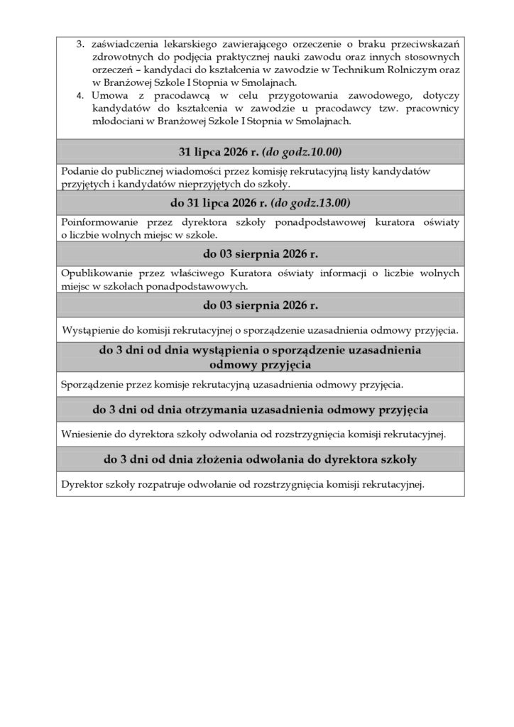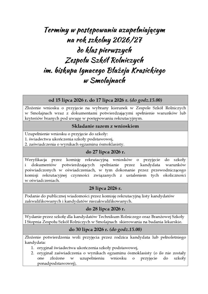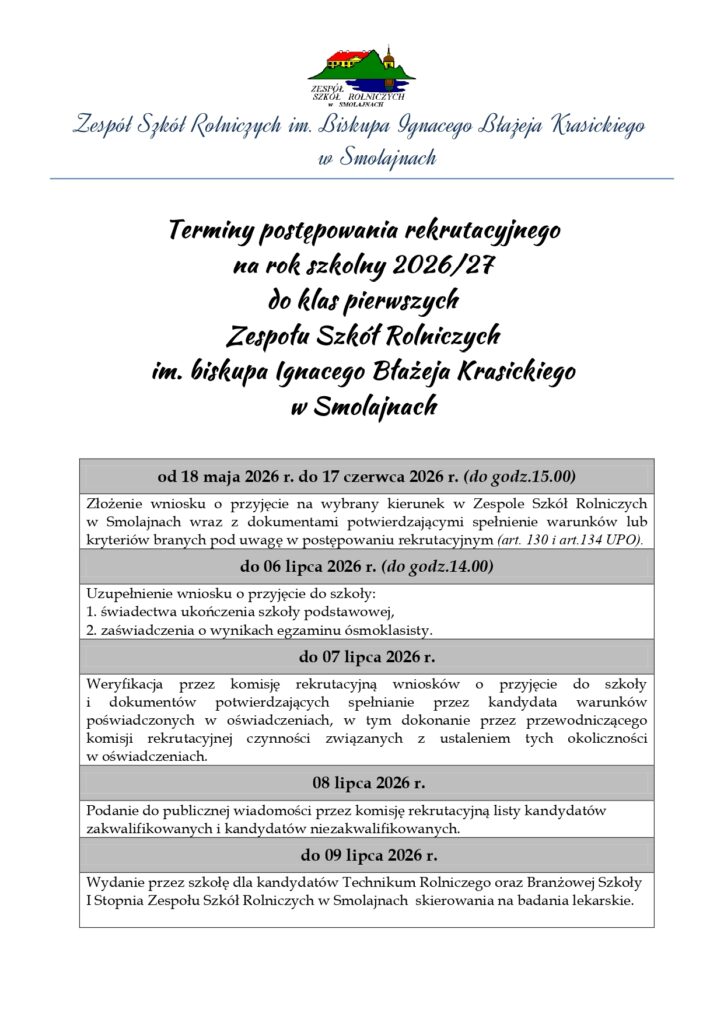 Wykaz dokumentów w postępowaniu rekrutacyjnym do Zespołu Szkół Rolniczych w Smolajnach na rok szkolny 2026/2027: